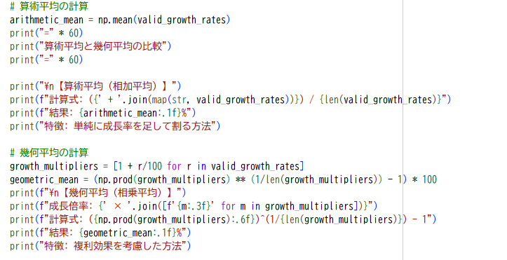ファイナンスでPyghonのコードを作成し、入力していくと、最後にprint関数がいくつも並びます。これは、段階的に説明しながら結果を表示し、計算結果を追いやすくしています。タイトル→セクション見出し→計算式→結果→説明の順になっており、教科書のように読みやすい出力になっているのです。Excelでは最終的な数値が出力されるだけですが、Pythonだと計算の流れがわかりやすくなるのです。