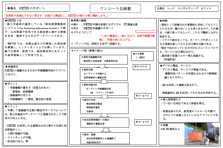 コラムNETIS(国土交通省 建設業新技術活用データベース)申請で磨いた「目的・構造・比較・適用範囲・効果」の5軸で整理する手法は、建設技術だけでなく、サービス業や士業などにもそのまま使えます。