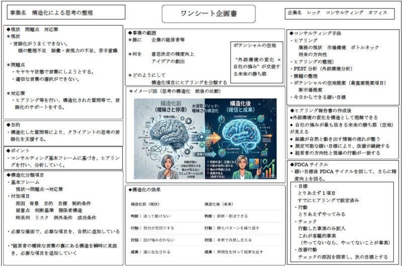 ワンシート企画書がようやく完成しました。 これは単なる資料ではなく、私自身の“分身”です。経営者の曖昧な言葉の裏にある構造を瞬時に見抜き、 暗黙知を言語化し、意思決定の精度を上げる。 そのプロセスを一枚に凝縮しました。